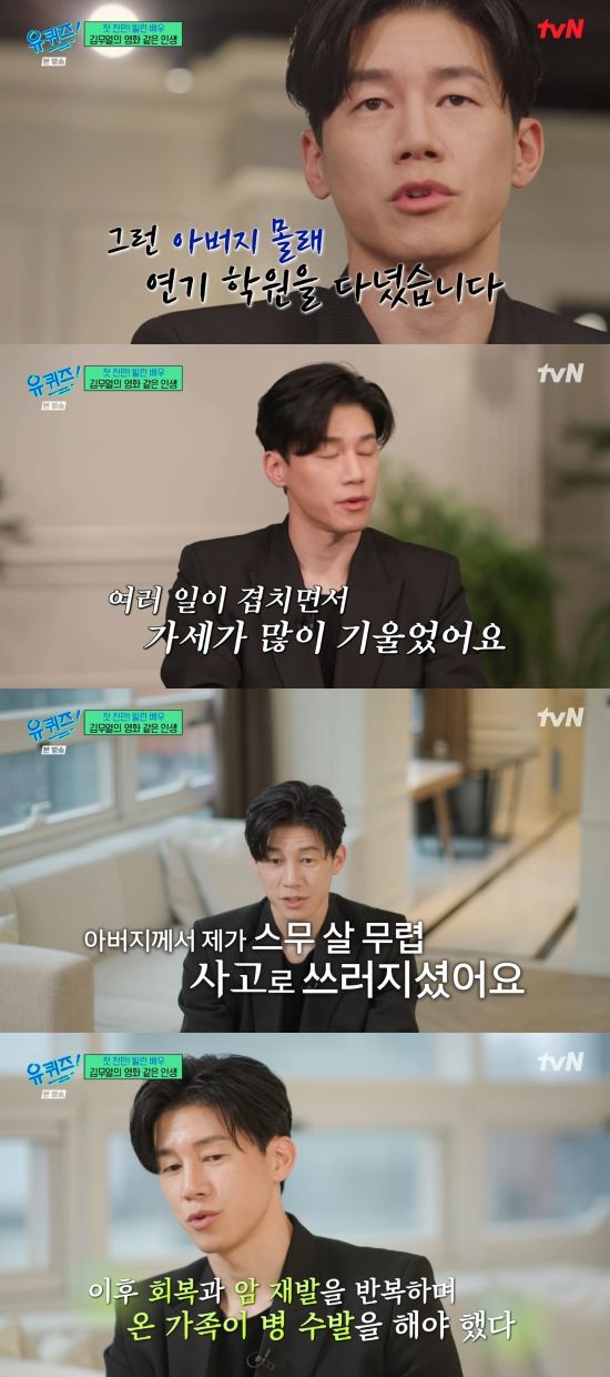 김무열은 "저희 아버지가 제가 스무 살, 스물한 살 이때 사고로 쓰러지셨다. 다치신 채로 발견이 돼서 그 상태로 경찰차를 타고 병원까지 갔다. 그때 딱 갔는데 아버지가 머리를 다 밀고 누워 계신 거다. 오랫동안 식물인간으로 누워 계시다가 또 암이 발견이 돼서 저희 가족이 아버지 암 치료를 계속 수발을 해야 됐기 때문에 항상 실려가고 또 병원 가고 그런 걸 반복을 하다 보니까 제가 저희 집 장남으로서 계속 그런 생각을 했었다. '강해져야 된다. 내가 굳건해야 된다'라는 생각을 많이 했었던 거 같다"라며 못박았다.