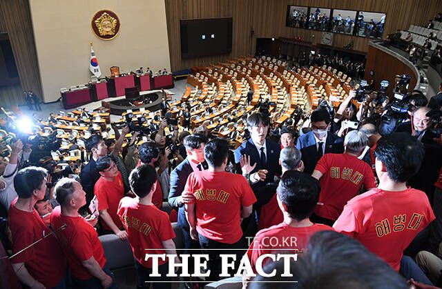 민주당 등 야권은 22대 국회에서 '채 상병 특검법'을 재추진할 계획이다. 사진은 지난 28일 재석 의원 294명 중 찬성 179표, 반대 111표, 무효 4표로 '채상병 특검법'이 부결되자 해병대 전우들이 국회를 향해 항의하는 모습. /남윤호 기자