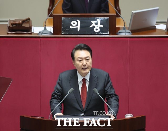 수평적 당정관계의 설정이 필요하다는 주장이 제기된다. 사진은 윤 대통령이 지난해 10월 국회 본회의장에서 2024년도 예산안에 대한 시정연설을 하는 모습. /이새롬 기자