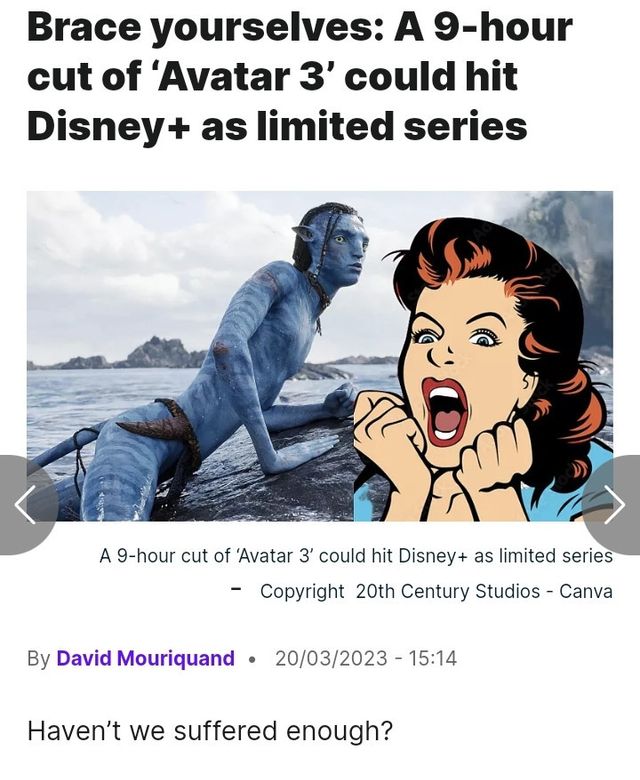확정되지는 않았지만, 제임스 카메론은 2-3시간 내외로 편집된 극장판을 개봉 후, 디즈니 플러스를 통해 9시간짜리 아바타3 시리즈물을 개봉하는 전략을 내세우고 있다 전해진다고…