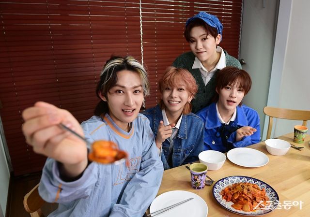 김치삼겹두루치기를 그야말로 ‘순삭’하며 티오지는 지난해 엠넷 오디션 프로그램 ‘보이즈 플래닛’에 함께 출연할 때만 해도 한 그룹 아래 “이렇게 같이 살게 될 줄은 몰랐다”고 웃어 보였다. 그걸 ‘한솥밥 먹는다’ 흔히 표현한다고 하자, 티오지는 “배우면 배울수록 한국어의 깊이는 남다르다”며 엄지손가락을 치켜세웠다.