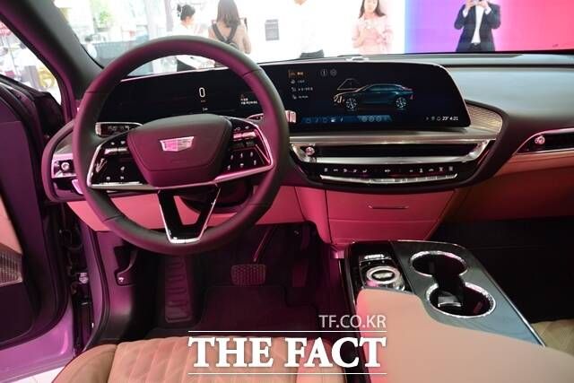 캐딜락 전동화 SUV 리릭의 운전석 모습. 캐딜락 스티어링 휠(운전대) 디자인은 과거 캐딜락의 대형 세단 '드 빌'의 스티어링 휠 디자인에서 영감을 얻었다. /김태환 기자