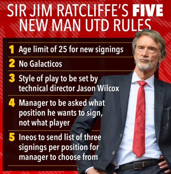 영국 매체 '더선'은 지난 29일(한국시간) "랫클리프 경은 이적 연령 제한을 포함해 차기 맨유 감독이 계속할 수 있는 5가지 엄격한 새 규칙을 설정했다"며 "누가 맨유 감독의 자리에 앉게 되든 짐 랫클리프 경과 그의 측근들이 클럽을 발전시킬 것이라고 믿는 몇 가지 규칙에 동의해야 할 것"이라고 전했다.