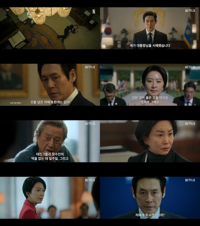 함께 공개된 티저 예고편은 심장을 부여잡고 쓰러지는 대통령과 “제가 대통령님을 시해했습니다” 라는 충격적인 ‘박동호'의 자백으로 시작하며 단번에 이목을 집중시킨다. 국무총리 ‘박동호’는 자신의 신념을 위해, 대통령의 시해를 감행하며 선을 넘는다. 거악을 단죄하기 위해 스스로 악이 되기로 결심한 ‘박동호’와 “강한 것이 옳은 것을 이기죠. 정치가 그래요”라는 말에서 알 수 있듯 그를 막아서 더 큰 권력을 거머 쥐려는 ‘정수진’. 어느 한 쪽도 선이라 할 수 없는 악과 악의 대결은 다이내믹한 전개로 시청자들에게 눈을 뗄 수 없는 강한 몰입도를 선사할 예정이다.