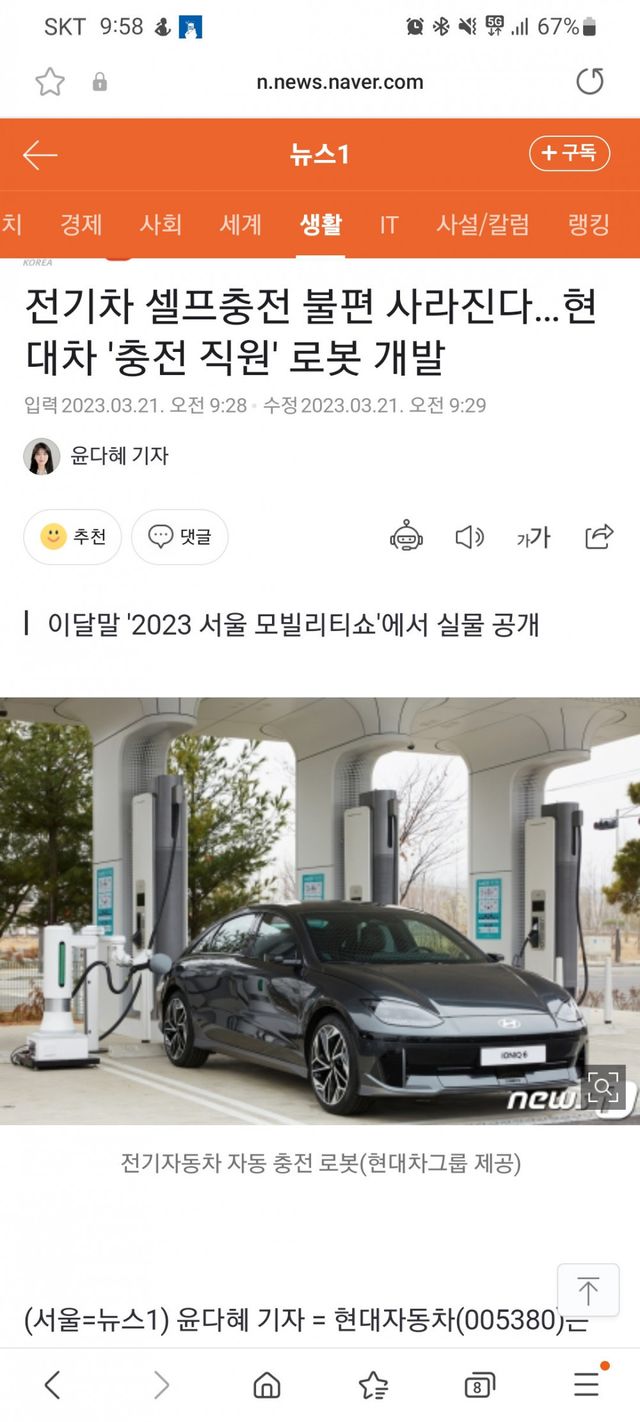 전기차가 충전 구역에 가면 저 로봇이 통신으로 충전구 열고 충전하고 돌아간다고 함