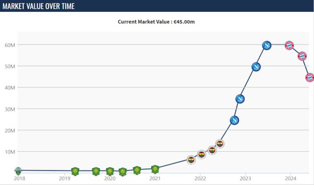 지난 2017년 전북 현대 시절 120만 유로(약 18억원)로 출발한 그의 시장가치는 베이징 궈안(중국) 이적 후 잠시 떨어졌다가 이후 뚜렷하게 상승곡선을 그렸다. 특히 페네르바체(튀르키예)를 거쳐 나폴리로 이적한 뒤에는 기울기가 더욱 가파르게 이어졌다. 지난해 3월 처음으로 5000만 유로 고지에 오른 뒤 나폴리의 세리에A 우승을 이끌고 세리에A 최우수 수비수상 수상 직후엔 6000만 유로까지 치솟았다. 6000만 유로의 시장가치는 바이에른 뮌헨 이적 후에도 지난해 12월까지 꾸준하게 지켜왔다.