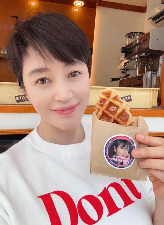 김혜수는 손에 와플을 든 채 환한 미소를 지어보이고 있다.