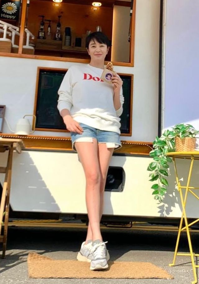 김혜수는 흰색 맨투맨에 숏팬츠를 매치해 캐주얼 룩을 선보이고 있다.