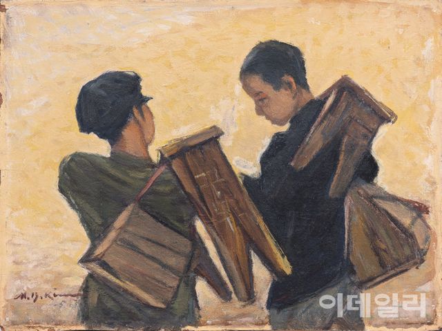 작가 김남배(1908∼1980)도 같은 마음이었을까. 묵직한 ‘장비’에 어깨가 내려앉은 소년의 등을 바라봤으니 말이다. 그 소년의 짐을 넘겨받으려 한 다른 소년의 눈빛에선 붓까지 묵직해졌을 거다. 한국전쟁 직후 흔한 풍경이던 구두닦이 소년들을 ‘흔치 않은 풍경’으로 가둬낸 ‘구두닦이’(1958)가 말이다.