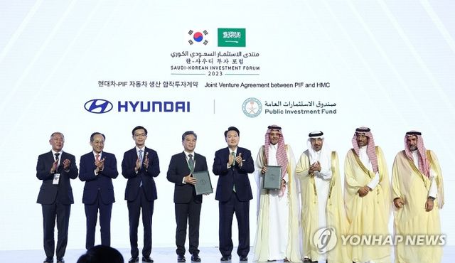 정의선(왼쪽부터) 현대차그룹 회장, 추경호 부총리 겸 기획재정부 장관, 방문규 산업통상자원부 장관, 장재훈 현대차 사장, 윤석열 대통령, 야지드 알후미에드 사우디 국부펀드(PIF) 부총재, 칼리드 알 팔레 사우디 투자부 장관이 지난해 10월 22일(현지시간) 리야드의 페어몬트 호텔에서 열린 현대차·PIF 자동차 생산 합작투자 계약에서 기념촬영을 하며 박수치고 있다. 사진=연합뉴스 제공