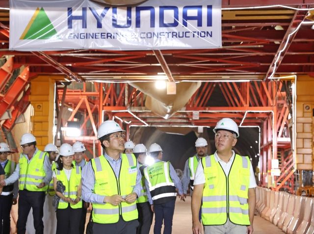 정의선 현대차그룹 회장이 지난해 10월 23일(현지시간) 사우디 서북부 타북주(州)에 조성 중인 네옴시티(NEOM CITY)의 주거공간인 '더 라인(THE LINE)' 구역 내 현대건설 지하터널 건설 현장을 방문해 임직원들과 악수를 나누고 있다. 사진=현대차그룹 제공
