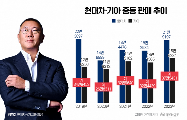 정 회장이 중동 시장에 공을 들이는 건 높은 성장 잠재력 때문이다. 중동 시장의 자동차 수요(2022년 기준)는 230만대 수준이지만 2030년 안에 300만대를 돌파할 것으로 예상된다. 미국과 유럽 등 선진시장보다 더 가파른 속도로 시장이 늘어날 수 있다는 얘기다.