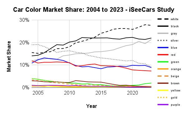 2024년 기준 가장 인기 있는 색상은 놀랍게도 여전히 흰색으로, 2004년 이후 시장 점유율이 12.5% 증가했다. 그 뒤를 검은색이 8%의 증가로 따르고 있다. 한편 은색은 같은 기간 동안 큰 하락을 겪어 시장 점유율이 13.5% 감소했다.