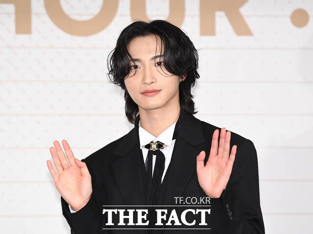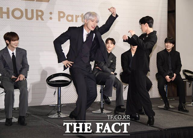 에이티즈 민기(왼쪽)와 산이 30일 오후 서울 종로구 포시즌스 호텔 서울에서 열린 미니 10집 '골든 아워 파트 1(GOLDEN HOUR : Part.1)' 기자간담회에서 타이틀곡 안무를 선보이고 있다.