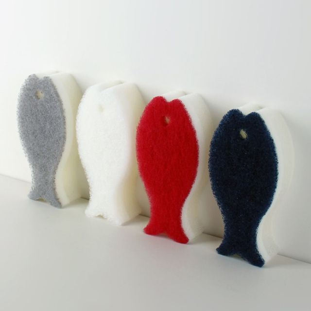 물고기 모던 스펀지 수세미가 새로운 색깔로 돌아왔어요. 꼬리 부분을 활용하면 컵의 바닥 면과 모퉁이도 깔끔하게 닦을 수 있죠. 일부러 설거지 거리를 찾게 되는 건 저 뿐인가요? 각 가격은 2천8백원.