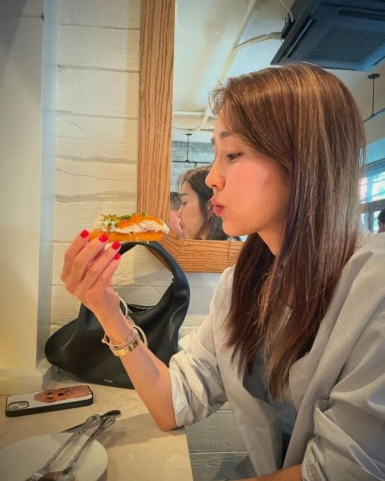 공개된 사진에는 먹는 것에 열중하고 있는 이진의 모습이 담겼다. 게시물을 본 성유리는 "내가 사랑하는 콧날"이라는 댓글을 남겼다.