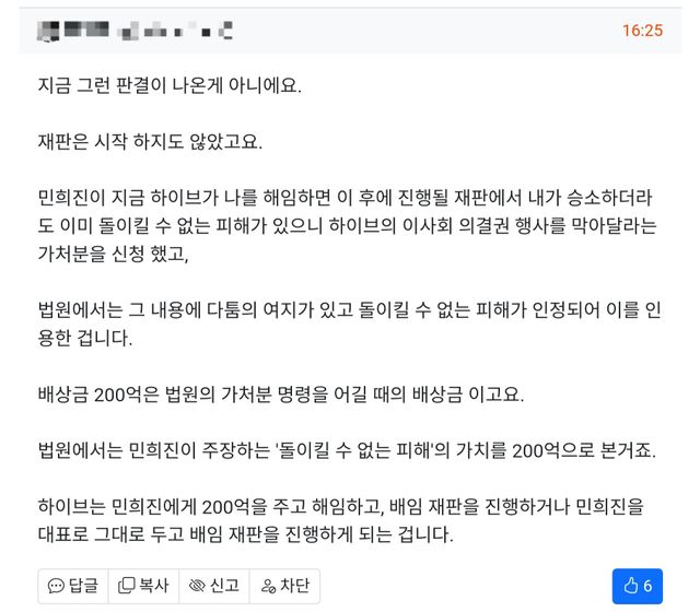하이브의 이사회 의결권 행사로 인한 해임에 대한 '돌이킬 수 없는 손해' 라고 본거뿐..