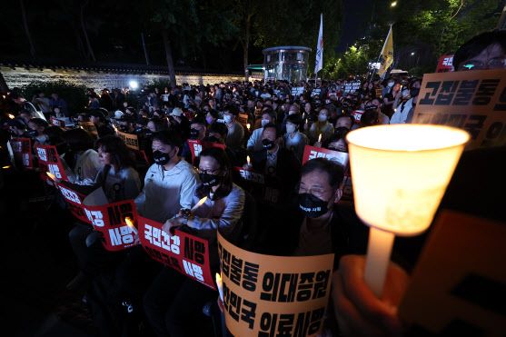 의협은 30일 서울 중구 덕수궁 대한문 앞에서 ‘대한민국 정부·한국의료 사망 선고’ 촛불집회를 진행했다. 이날 대한문 앞에는 주최 측 추산 5000여명이 촛불을 들고 모였다. 의사와 의대생, 학부모들은 검은색 옷을 입고 ‘보건복지부 사망’, ‘한국 의료 사망’, ‘의학교육 사망’이라고 적힌 마스크를 착용했다. 이들은 “무너진 의료정책에 국민도 의사도 희망이 없다”며 의대 증원을 강하게 비판했다.