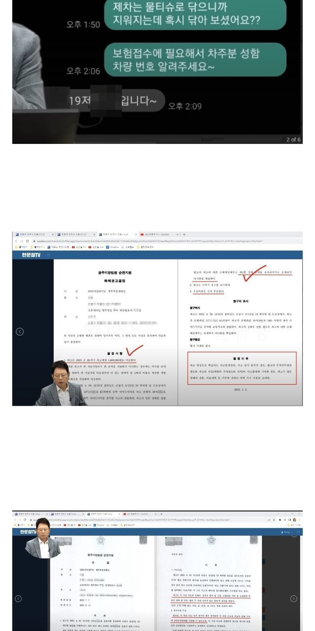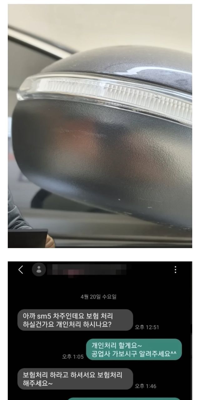 1. 상대 차주(왼쪽 주차된 차)가 사이드미러 부딪히고 목 어깨 아프다고 한방병원행