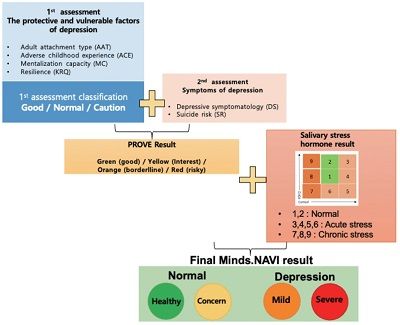 마인즈내비는 설문 평가 도구인 PROVE 검사와 타액 내 바이오마커 분석 시스템으로 구성되어 있다.