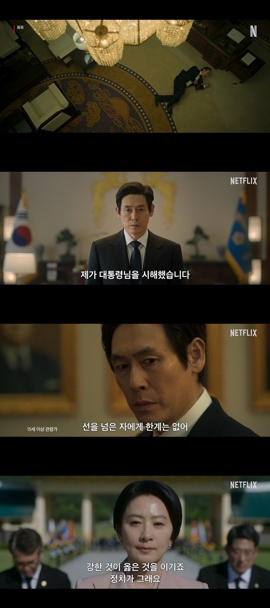 공개된 티저 포스터는 쓰러진 대통령과 이를 뒤로 한 채 대치하고 있는 국무총리 박동호(설경구 분)와 경제부총리 정수진(김희애)의 모습을 담아 눈길을 사로잡는다.