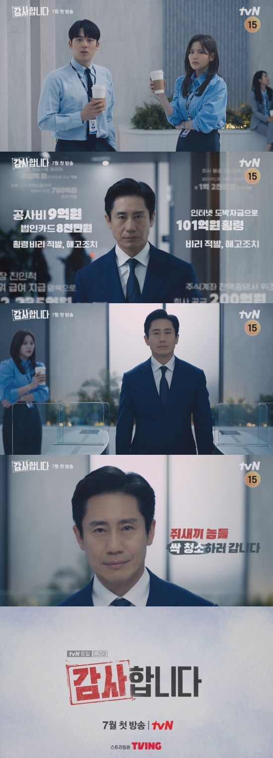 tvN ‘감사합니다’는 횡령, 비리, 사건사고가 끊이지 않는 건설회사 감사팀을 배경으로 회사 갉아먹는 쥐새끼들을 소탕하러 온 이성파 감사팀장 신차일과 감성파 신입 구한수(이정하 분)의 본격 오피스 클린 활극을 담은 드라마.