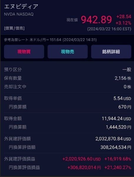 온라인 커뮤니티에 올라온 사진은 올해 3월 22일 A 씨가 보유하고 있는 보유 주식 현황을 갈무리한 사진이었다. 이날 엔비디아 주식은 942.89달러(약 130만 원)로 마감했다. 따라서 A 씨의 평가 손익은 202만 926.6달러(약 27억 5900만 원)에 달했다. 수익률은 약 1만 7000%, 총평가액은 203만 2870.84달러(약 27억 7500만 원)이었다.