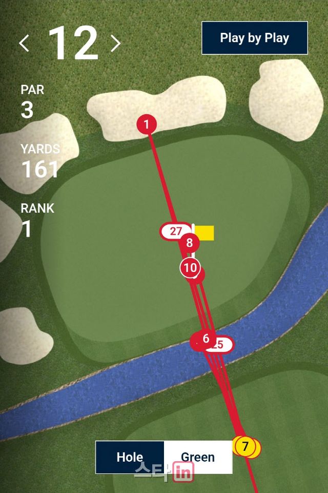 이 홀의 기준 전장은 161야드다. 1라운드에선 티박스를 2야드 뒤로 빼놔 163야드로 진행했다. 그린 앞쪽에는 개천이 흐르고 뒤쪽으로는 벙커가 있으며, 그린은 벙커 쪽에서부터 개천 쪽으로 경사가 심하다.
