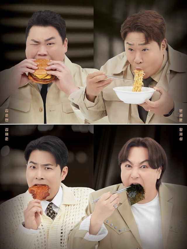 4분할 컷에서 김준현은 얼굴만 한 햄버거를 한입에 크게 베어 무는 모습으로 압도적인 존재감을 뽐낸다. 문세윤은 라면 한 그릇을 통째로 빨아들 것 같은 면치기로 먹방 점령을 예고했고, 황제성도 폭주하는 듯한 한입만 포즈와 김해준의 통닭다리 먹방은 재미를 넘어선 국보급 볼거리를 선사할 예정이다.