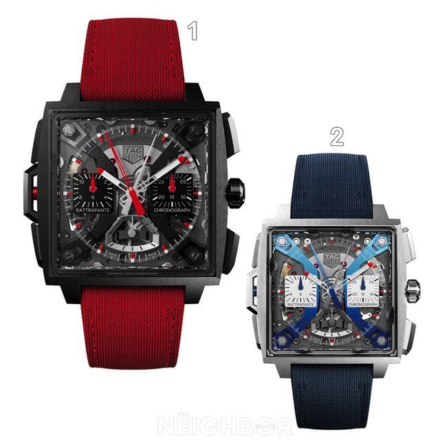 1 레이싱 헤리티지의 역동성을 반영한 레드 컬러의 모나코 스플릿 세컨드 크로노그래프. 2 정밀한 시간 측정의 상징, 모나코 스플릿 세컨드 크로노그래프.