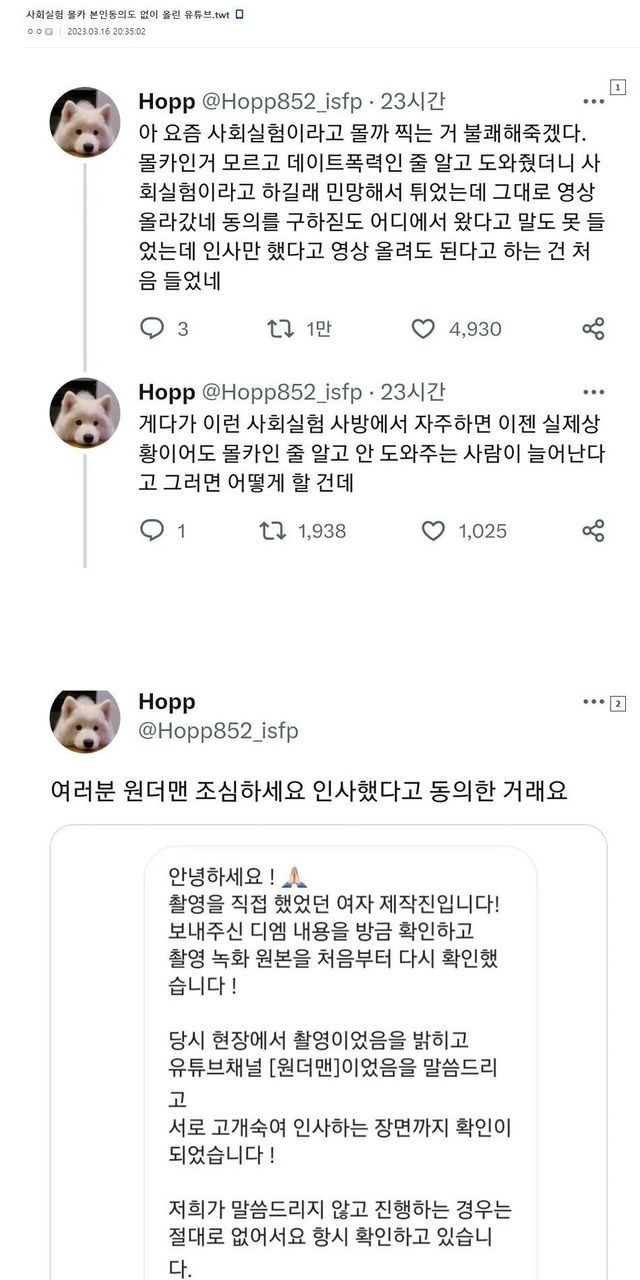 사회실험 본인 동의 안 하고 올린 정신나간 유튜브 …