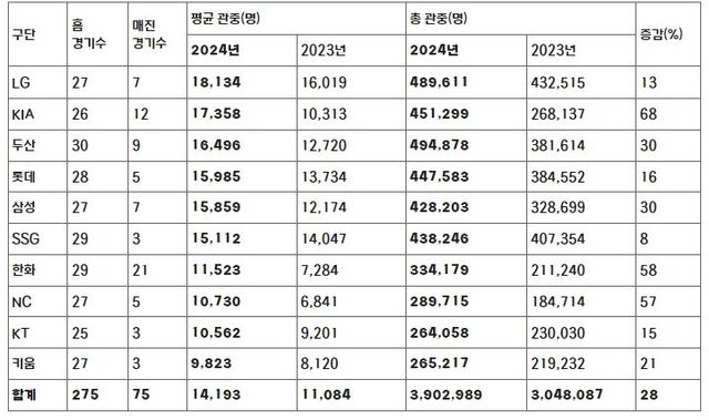 관중 증가율은 봤을 때 팀 순위 1위를 달리고 있는 KIA가 68%의 관중이 증가하며 가장 높은 증가율을 보였다. 한화는 58% 증가율로 2위에 올랐으며, NC가 57%로 3위에 올랐다.