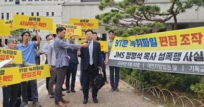 이날 항소심 공판 후 정명석 목사 측 변호인 이경준 변호사는 대전고법 정문 앞에서 기자회견을 열고 “오늘 재판에서는 1심에서 유력한 증거로 채택이 된 피해자의 당시 현장 녹음파일에 대한 얘기가 있었다”면서 “현장 녹음파일 부분에 대해서 피고인 변호인 측에서 감정을 의뢰해서 받아본 결과, 녹음파일이 편집·조작되었다는 결론이 나왔다”고 주장했다.