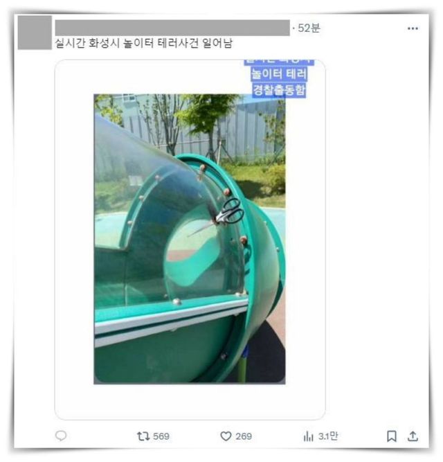 31일 오후 한 엑스(옛 트위터) 계정에 "실시간 화성시 놀이터 테러 사건 일어남"이라는 글과 함께 사진 한 장이 올라왔다. 이 사진에는 어느 놀이터 미끄럼틀 기구 하단 쪽에 가위가 박혀 있는 모습이 담겨 있다. 사진 속 미끄럼틀 기구는 가위 등이 쉽게 박히지 않는 플라스틱 소재인 것으로 판단된다.