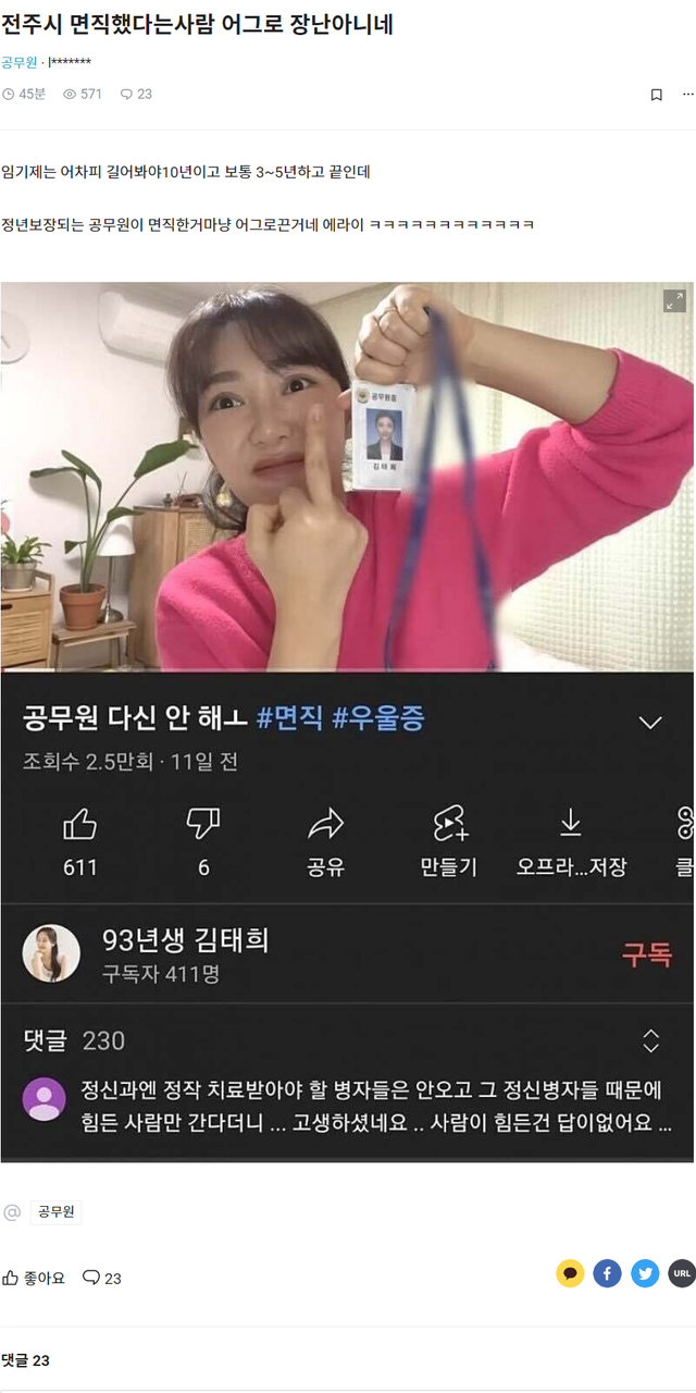 임기제 공무원이라 기간지나면 어차피 관둬야되는데 면직한거처럼 어그로끈다고 올라왔음