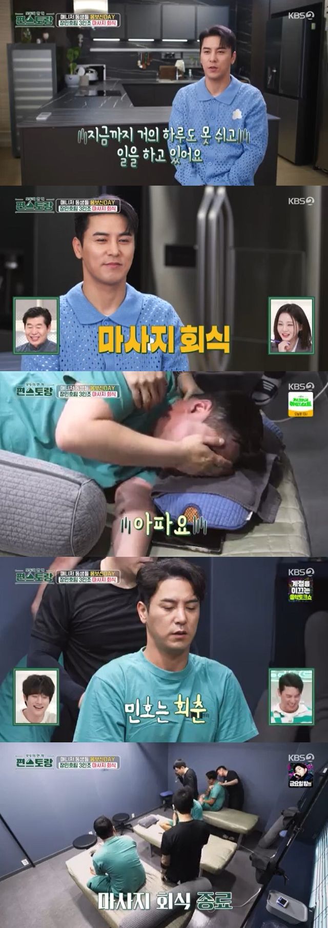 장민호는 마사지가 끝난 후 회춘한 얼굴로 "너무 시원하게 잘 받았다"고 말해 웃음을 자아냈고 매니저들 역시 퉁퉁 부은 얼굴로 "확 출출해졌다. 특별하게 몸보신할 수 있는 음식을 먹고싶다"고 말했다.