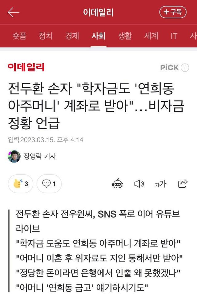 그는 “저희 할머니(박순자씨)께서 학자금을 지원해 주실 때 연희동 자택에서 일하고 계신 아주머니 분들 계좌를 사용해 돈을 보내주셨다”고 주장했다. 손자 학자금 지원조차도 가족과 무관한 인물 계좌를 통해 전달됐다는 것이다.