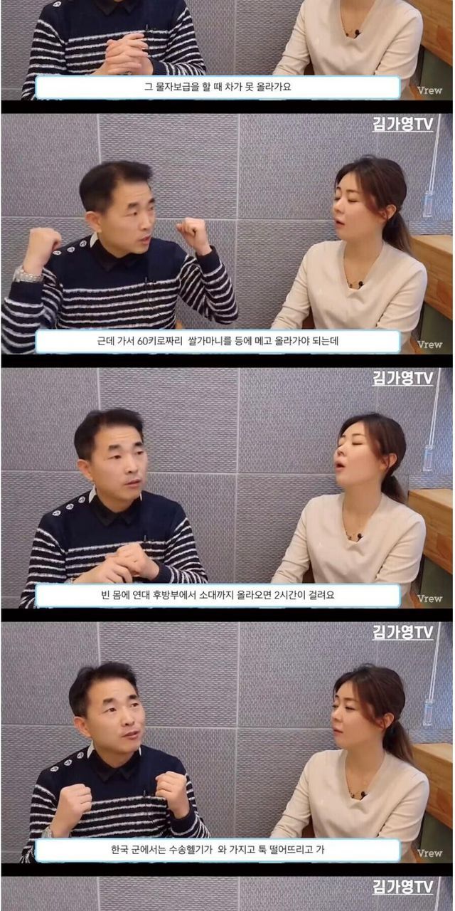 자기들은 직접 몸으로 보급해야되는데 한국부대는 헬기가 툭하고 떨구고 가는거보고 현타 쎄게와서 탈북