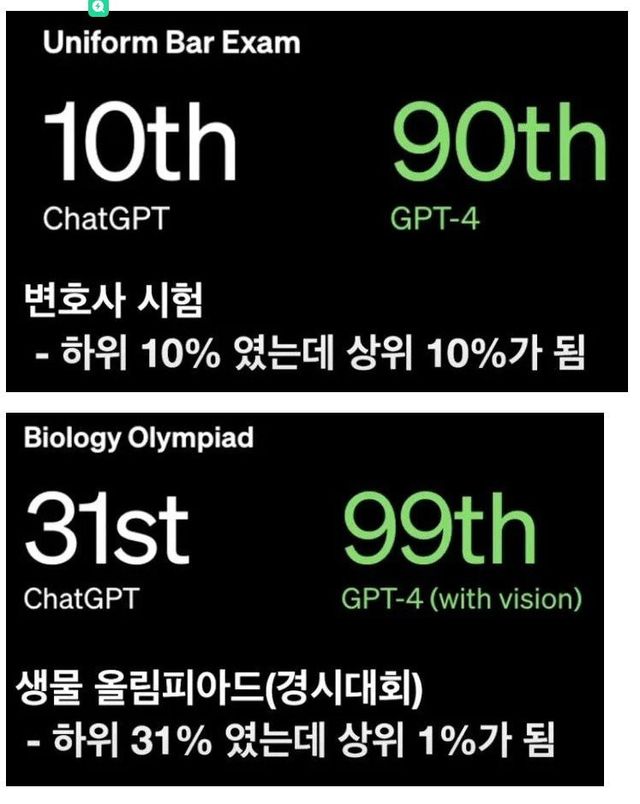 챗GPT는 미국 변호사 시험에서 하위 10%의 성적을 받았지만 GPT-4는 상위 10% 점수를 받음.