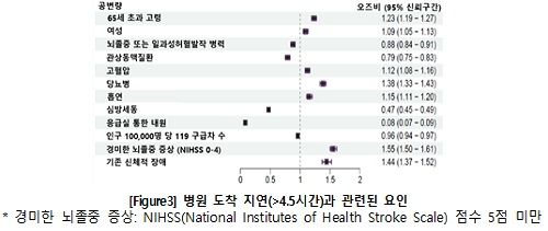 추가로 다변량 로지스틱 회귀 분석을 진행한 결과, 병원 도착 지연에 독립적으로 영향을 미치는 요인은 경미한 뇌졸중 증상(1.55배), 기존 신체적 장애(1.44배), 당뇨병(1.38배), 65세 초과 고령(1.23배), 흡연(1.15배), 고혈압(1.12배), 여성(1.09배) 순으로, 이 요인들을 가진 환자들이 골든타임 이내에 병원에 오지 못할 위험성이 높았다.