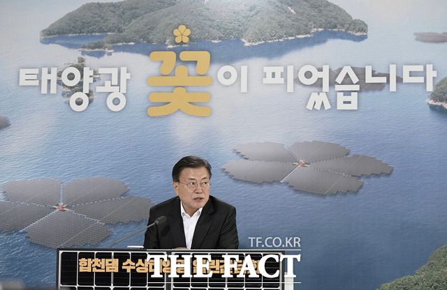 문재인 대통령은 재임시절 신재생을 확대하는 에너지 정책을 펼쳤다. 사진은 문 대통령이 대통령시절 경남 합천댐 물문화관에서 열린 합천댐 수상태양광 발전개시 관련 열린 간담회에 참석해 지역주민 및 전문가들과 대화를 나누고 있는 모습. /청와대 제공