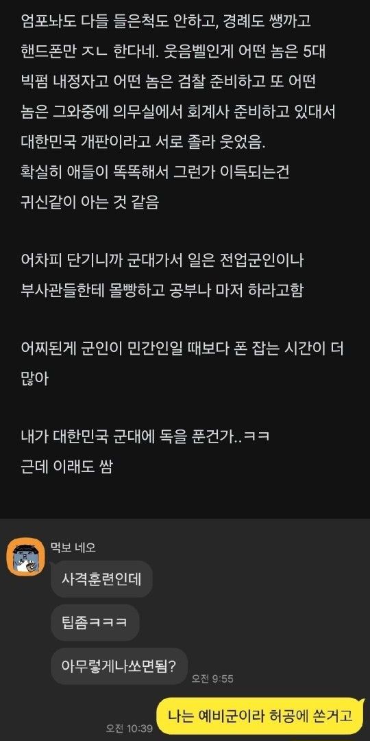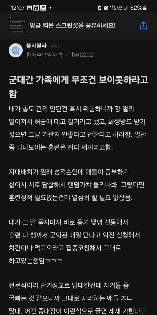 군대간 가족에게 모든 훈련 보이콧하라고 했습니다.wow