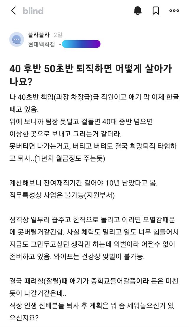 분명 블라인드에 대기업 다니는 사람들이… 대기업 정년보장 되는데다 퇴직해도 다들 계열사나 하청 임원으로 빠져서 주구장창 잘먹고 잘산다 그랬는데….