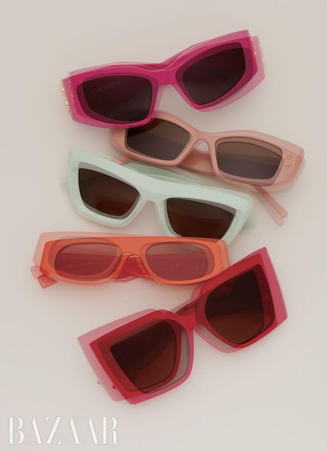 (위부터) 푸크시아 핑크 컬러의 ‘보시 캣’ 선글라스는 가격 미정 Balenciaga. 스터드를 장식한 엔드 피스가 특징인 선글라스는 91만원 Valentino. 민트 컬러 선글라스는 66만원 Bottega Veneta. 틴티드 렌즈가 돋보이는 선글라스는 가격 미정 Gucci. 버터플라이 프레임의 선글라스는 가격 미정 Alexander McQueen.