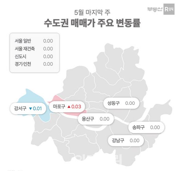 서울 개별지역은 마포가 0.03% 상승했고 강서가 0.01% 떨어졌다. 나머지 지역은 보합(0.00%)을 나타냈다. 신도시는 모든 개별지역이 보합(0.00%)을 기록했다. 경기ㆍ인천은 △화성(0.03%) △의정부(0.02%) △수원(0.02%) 등이 오른 반면 ▽이천(-0.03%) ▽시흥(-0.02%) ▽인천(-0.01%) ▽고양(-0.01%) ▽오산(-0.01%) 등은 떨어졌다