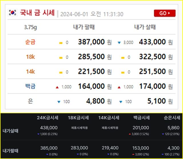 순금(24K) : 매입가 43만 3000원, 매도가 38만 7000원