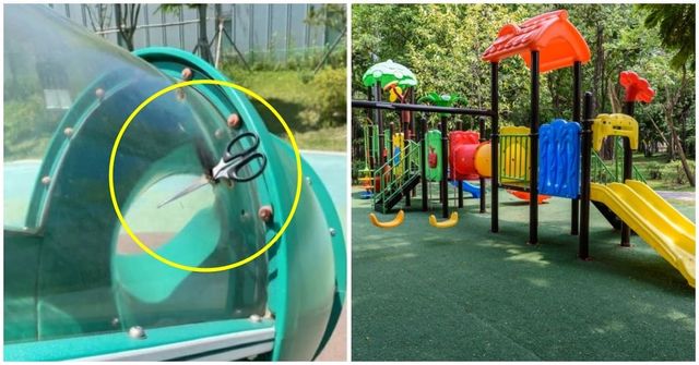 지난달 31일 'X'에 올라온 화성시 놀이터 사진, 누군가 주방 가위를 미끄럼틀 상단에 꽂아 놨다. / 'X'(옛 트위터)