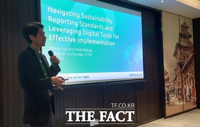 탄소관리 선도기업 ㈜하나루프는 자사의 기후규제 대응 탄소중립 플랫폼인 하나에코가 지난달 30일 국제공인 인증기관인 로이드인증원(LRQA)으로부터 한국 배출권거래제 및 유럽연합(EU)의 탄소국경조정제도(CBAM) 지침에 부합한 것으로 적합성을 인정받았다. 사진은 네팔 수도 카트만두에서 탄소관리 플랫폼에 대한 교육을 실시하고 있는 하나루프 안영석 CTO./하나루프