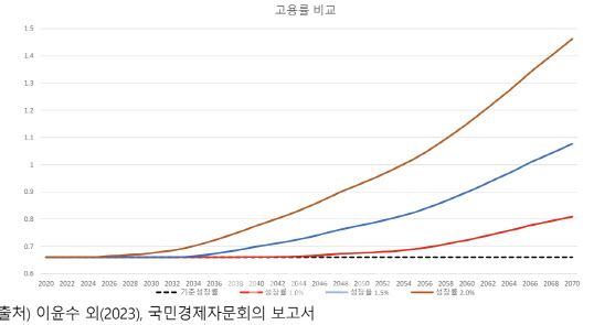 지난 2023년 7월 한국경제학회가 국민경제자문회의의 요청으로 연구해 냈던 ‘한국경제 성장의 현황과 도전 : 성장의 지속성과 역동성’ 논문을 보면 2070년까지 1% 경제성장률을 유지하려면 고용률을 80%까지 높여야 합니다.