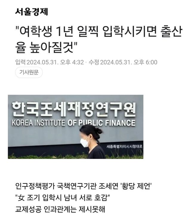 “남성의 발달 정도가 여성의 발달 정도보다 느리다는 점을 고려하면 학령에 있어 여성들은 1년 조기 입학시키는 것도 향후 적령기 남녀가 서로 매력을 더 느낄 수 있도록 하는 데 기여할 수도 있을 것”